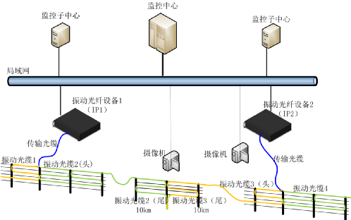 周界入侵安防系統(tǒng)由定位型振動光纖預警系統(tǒng)、攝像機以及其他電子設備等構成。本方案主要描述定位型振動光纖預警系統(tǒng)的結構組成以及與攝像機的聯(lián)動。