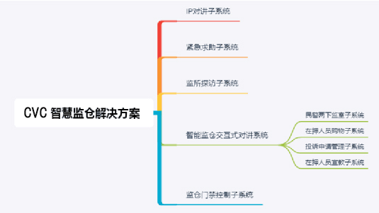 CVC智慧監倉解決方案由IP多媒體對講子系統、緊急求助對講子系統、監所探訪對講子系統、監倉門禁控制子系統、民警二下監室子系統、在押人員購物子系統、投訴申請管理子系統、在押人員宣教子系統八大系統協同運作,對監倉進行全方位的智能化管理。