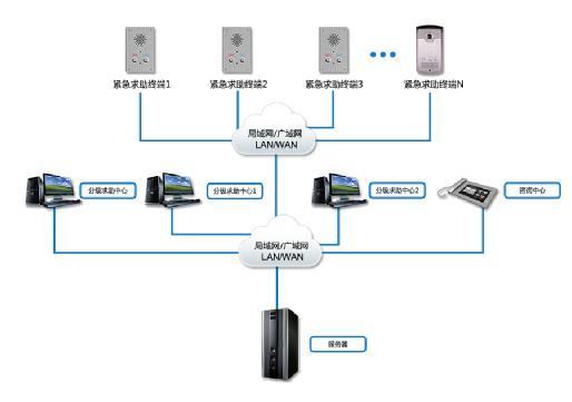 系統(tǒng)硬件由管理中心設備、終端求助設備、以及將管理設備和終端設備連接起來的網絡設備。通常情況下,系統(tǒng)利用現有的互聯網、企業(yè)內部的局域網構建,使建設成本大大降低。