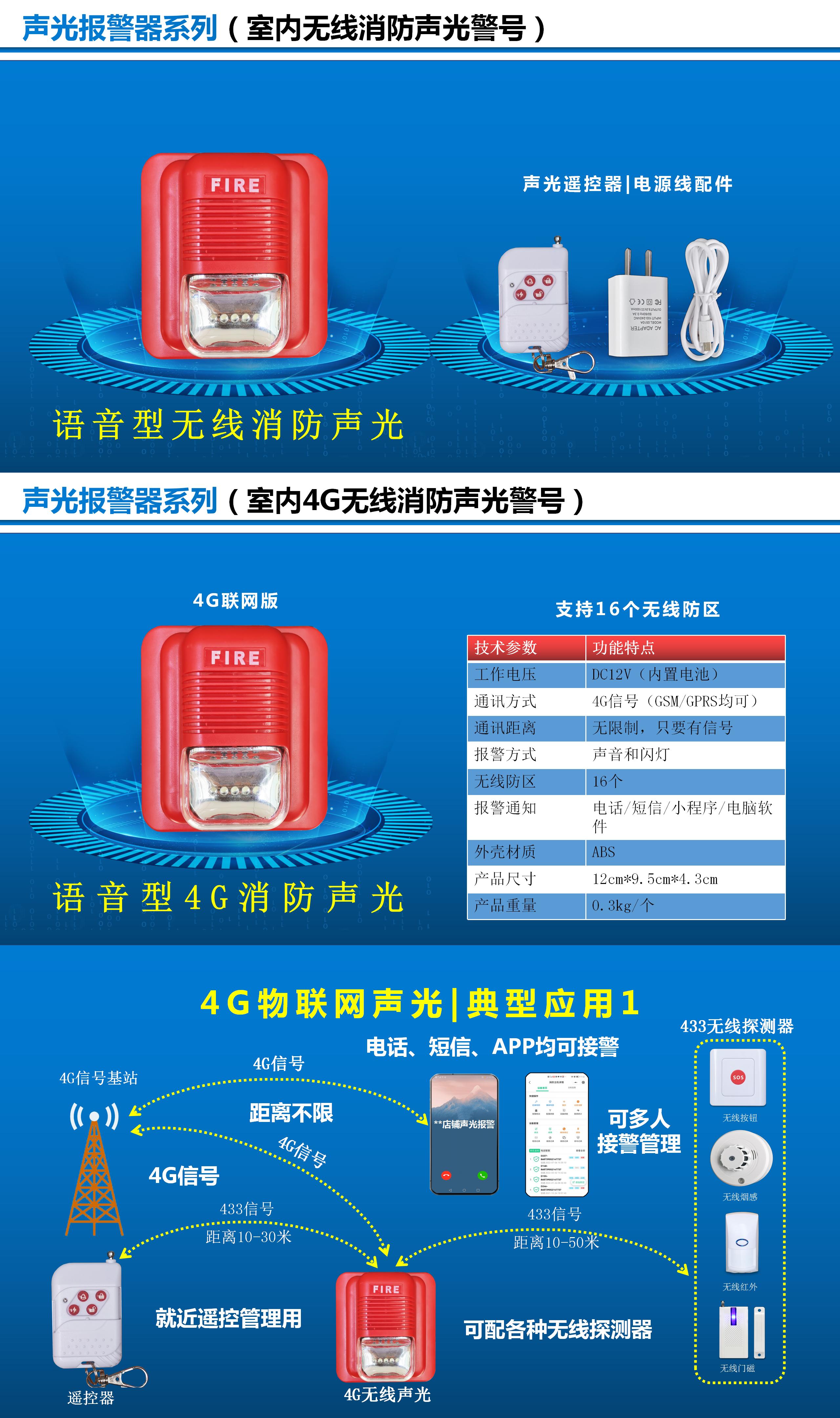 擴展通訊:LORA/4G(GSM/GPRS)/NB 等方式 標配: 1 聲光主機、1 電源插頭、1 充電線