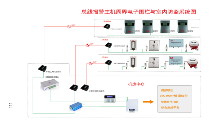 當(dāng)有疑犯通過(guò)攀爬圍墻或者剪斷高壓線的方式進(jìn)入軍區(qū),脈沖電子圍欄會(huì)發(fā)出報(bào)警信息,同時(shí),電子圍欄主機(jī)通過(guò)光纖將信息傳回到監(jiān)控中心,再通過(guò)聯(lián)動(dòng)模塊與總線主機(jī)相結(jié)合的方式來(lái)處警。