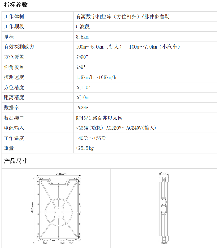 雷達主要由一個雷達陣面和一個電源適配器組成,采用MIMO體制和DBF技術的有源相控陣雷達,主要用于邊境、周界、檢查站、軍事基地等重點區域內行人、車輛的探測、警戒和目標指示,能夠準確的給出目標的方位、距離和速度等航跡信息。