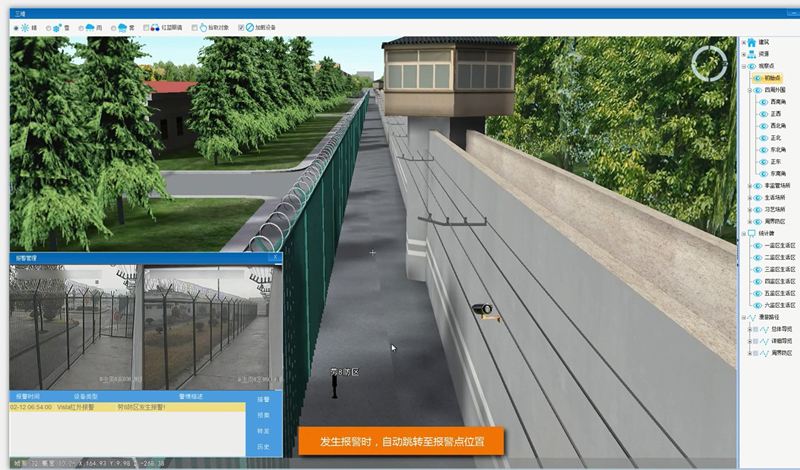 周界防范微波雷達可以控制攝像機聯動,在監墻警戒線內每100米(根據現場環境選擇不同型號)左右安裝一臺雷達,運用微波偵測原理,形成一個100米長、6米高、5度夾角的橢圓型警戒空間監視區,當可疑人員進入警戒區或者穿越警戒線時,雷達測出可疑人員距離雷達的距離、方向和速度,通過通信網絡發送到后臺控制中心,由控制中心解算出可疑人員距雷達的距離,運動速度和方向,并根據距離信息,控制攝像機的電動變焦鏡頭,從而清晰捕捉到發現可疑人員的區域情況。控制中心同時與監控中心和武警監控中心聯動,將相關信息發送到主控中心,軟件平臺會自動彈出報警電子地圖,聯動視頻圖像,并可在多個指定的監視器上同時彈出報警位置視頻畫面,系統與視頻監控進行聯動并可將該區域監控圖像到自動切換到大屏幕畫面。