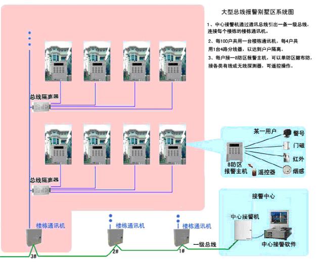 本系統嚴格按照國家安全防范關規定和要求,結合現代化別墅群的實際情況,在別墅群的每住戶室內安裝一套報警主機,每四住戶合用一臺4路總線隔離器,結合一臺樓棟通訊機及相應的報警管理中心軟件來實現住戶報警系統,以確保商戶財產安全。